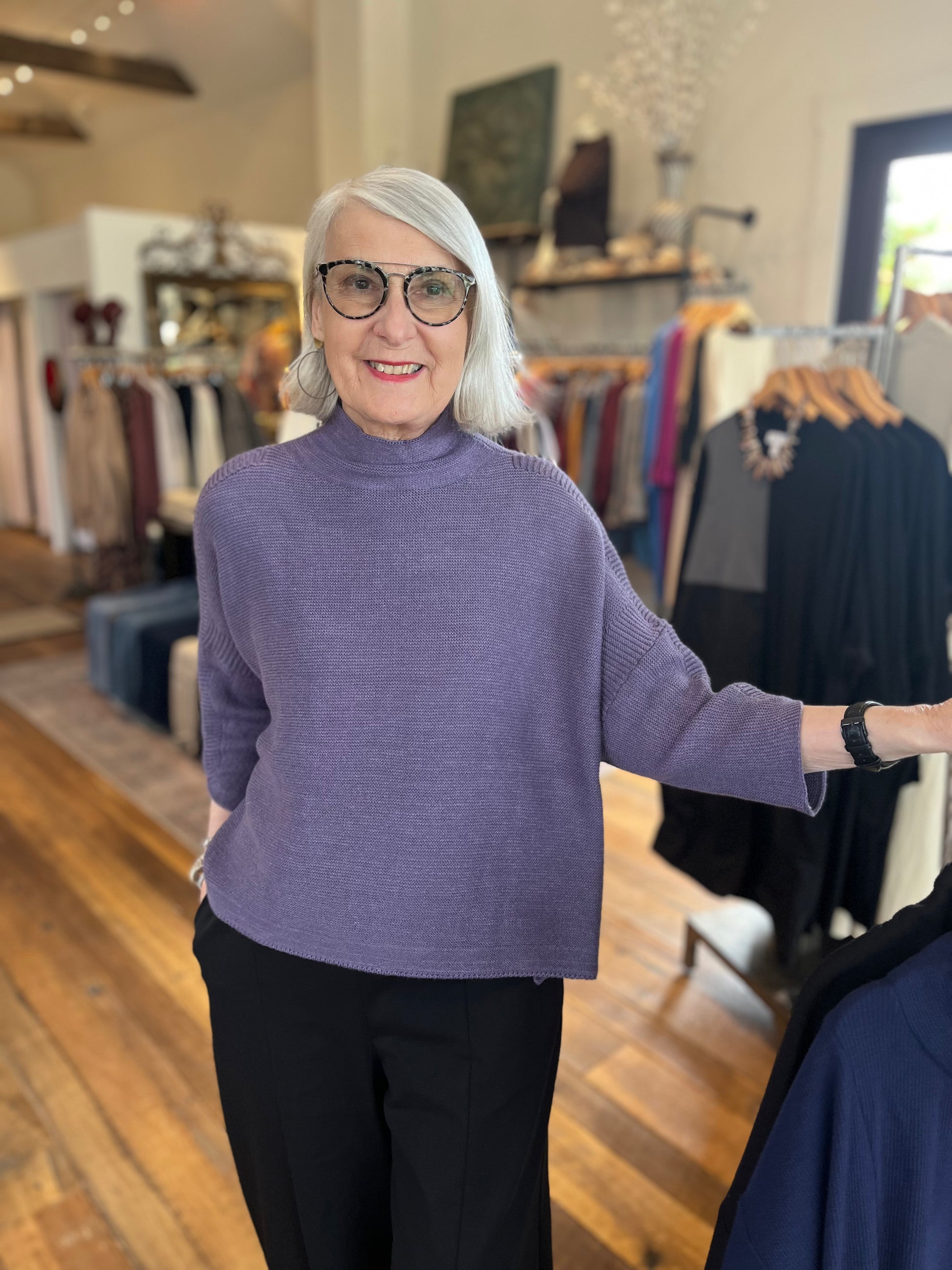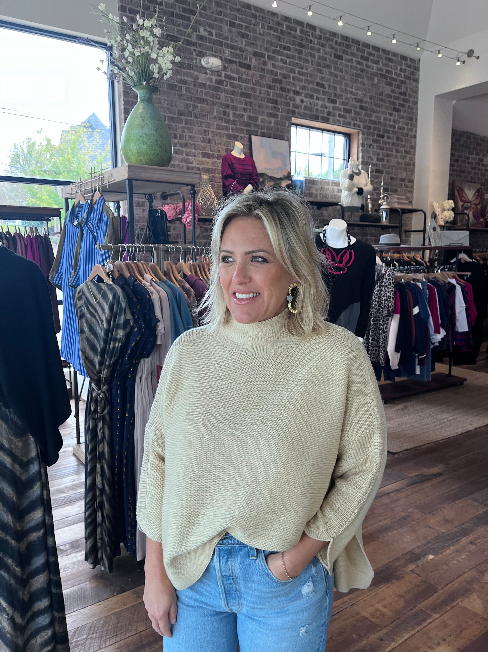 OVERSIZED TURTLENECK HI/LO SWEATER IN GARTER STITCH WITH 3/4 SLEEVE, CONTRASTING RIB ACCENTS AND SIDE SLITS