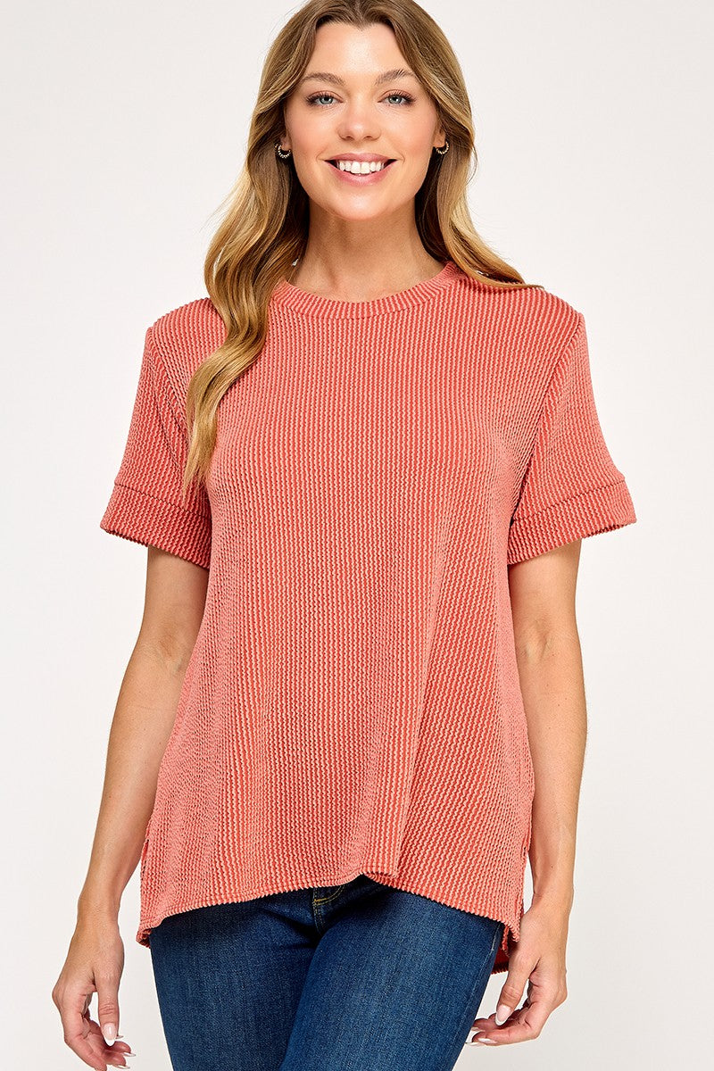 Curly rib t shirt Short sleeve Round neck Side slits Curly rib fabric with good stretch